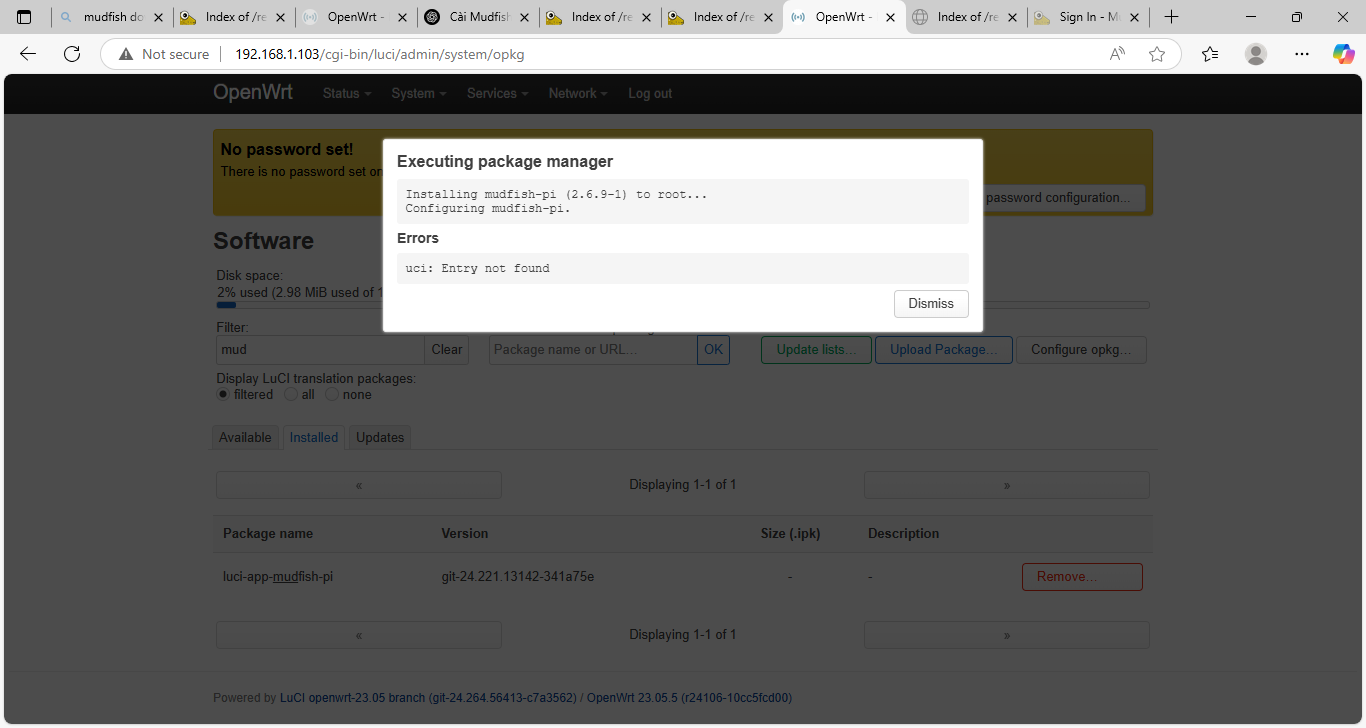 This error occurs when I trying to install Mudfish to my router, it’s saying: “uci: Entry not found”.
