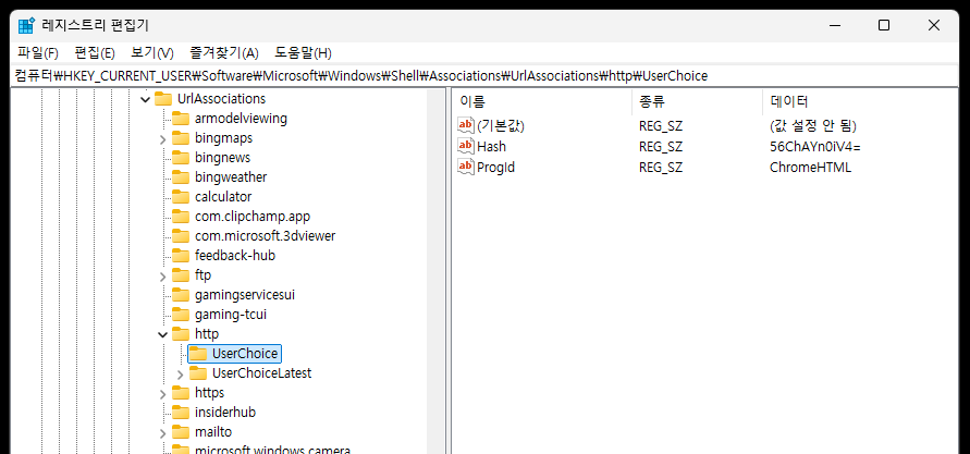 .htm,.html) 및 프로토콜(HTTP,HTTPS)의 기본 앱을 수동으로 전부 Chrome으로 지정했습니다.