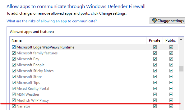 However, i have allowed mudfish WPN on the list of approved apps on Windows Defender