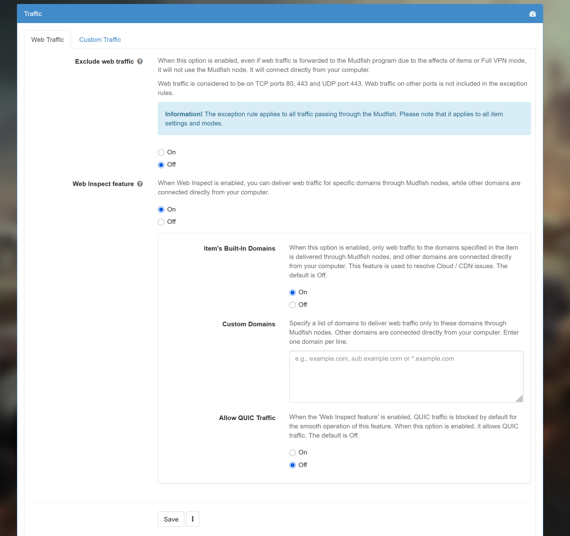 Did you try to use WFP Item mode enabled instead of this “exclude” or “web inspect” rules?