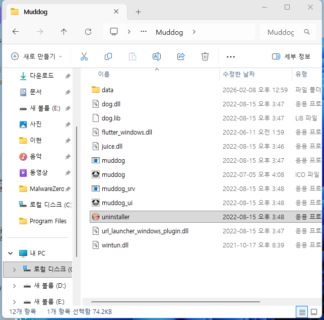 혹시 제어판에 “설치된 앱” 부분에 muddog 항목은 삭제되신 것인지도 궁금합니다.