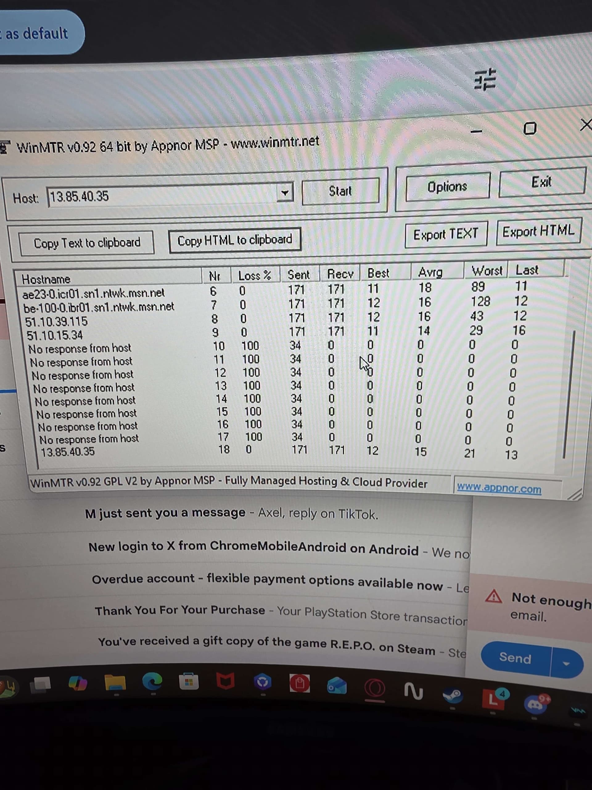 I ran a WinMTR test to the Dallas TX Azure node (13.85.40.35) and found that all packets are being dropped starting at Hop 10.