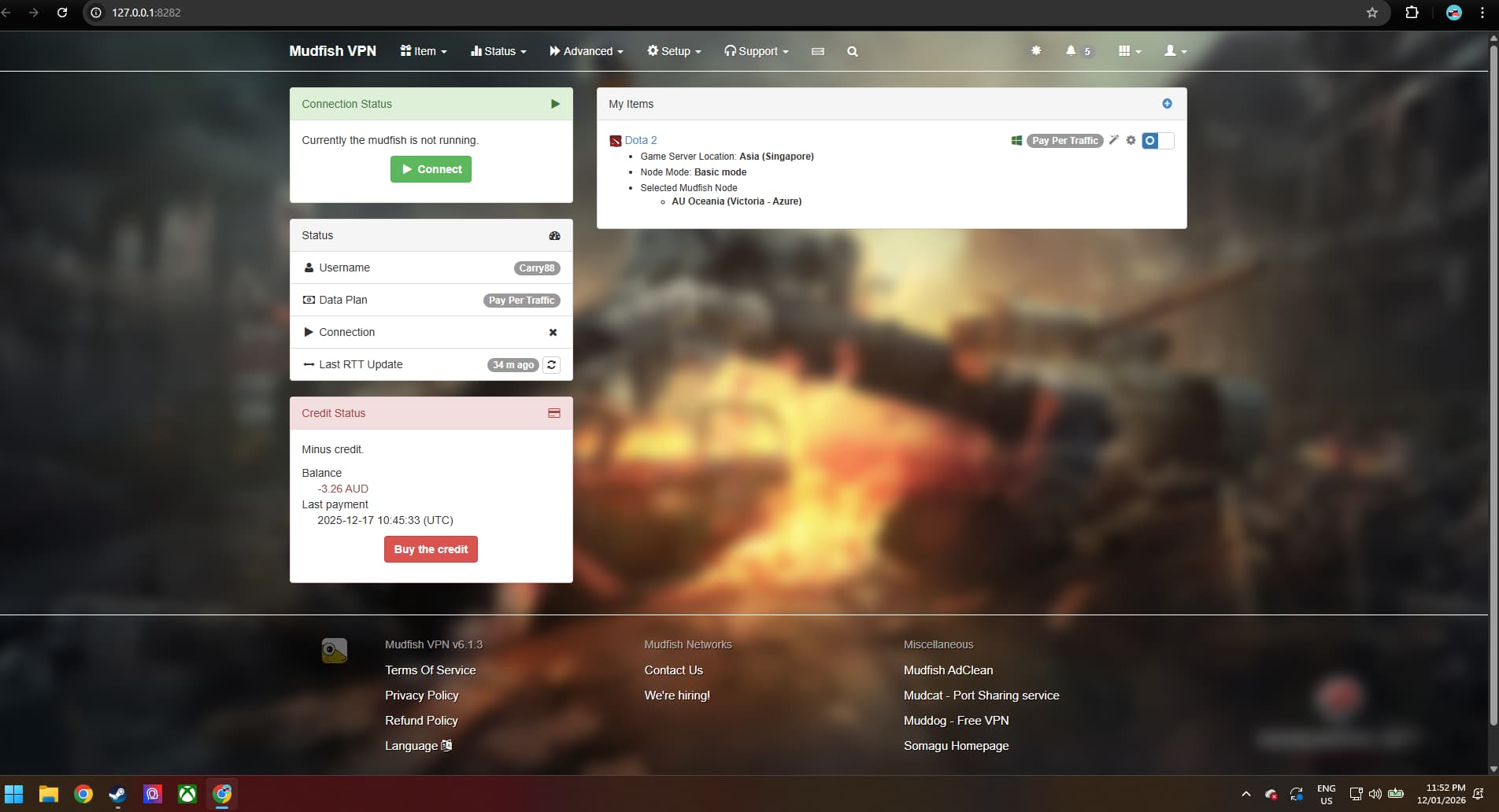 My credits were unexpectedly drained and my balance went negative. I only use Mudfish for Dota 2 and I do not have Full VPN on. Please investigate and refund the missing credits if appropriate.