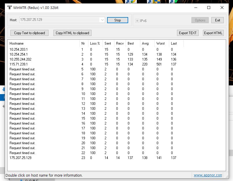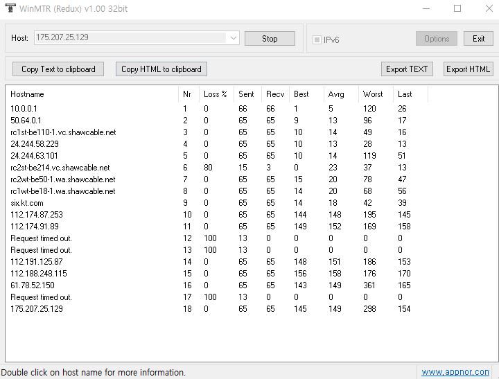 혹시 기회가 되신다면 WinMTR 을 이용한 네트워크 분석 문서를 참고하셔서 175.207.25.129 (던전 앤 파이터 - Asia (South Korea)) IP 를 대상으로 테스트를 부탁드립니다.